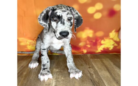 Great Danes trace back to Germany several centuries ago, first bred to track and hold big game. The merle version carries the same ancestry; the difference is a naturally occurring gene that scatters darker patches across a lighter background, giving the coat its signature swirled look.